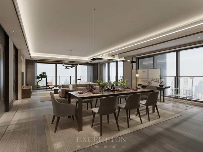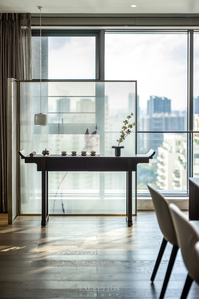 項(xiàng)目坐落于深圳華僑城的新天鵝堡,坐享海灣山湖的自然美景,380㎡私享空間,約7.2m寬的觀景陽臺(tái),南北通透,三面采光,四室三廳,這樣開放與獨(dú)立兼顧的空間,給了設(shè)計(jì)與生活多種互動(dòng)的可能性。業(yè)主是一對恩愛夫妻,他們對清雅閑適的生活有著深深的渴望。鴻藝源設(shè)計(jì)將中式情韻以簡雅靜寧的格調(diào)呈現(xiàn)出來,讓居者在木作的紋理、陽光的滲透、清茶的幽香中,品味生活的煙火氣與安適感。