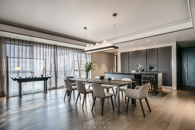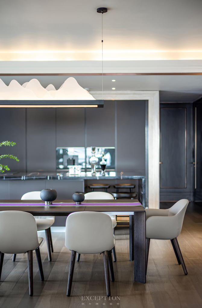 餐廳延續(xù)會(huì)客廳空間的基調(diào),臻選意大利 Poliform 餐桌椅,精致的亞克力山水造型燈飾,以簡單的形制禮遇生活之美。