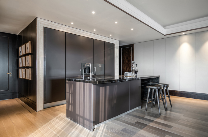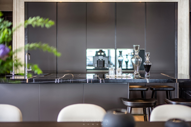 西廚島臺(tái)采用大理石與木材無縫貼合,睿智的黑在空間中煥發(fā)著張力,突出設(shè)計(jì)臻選的態(tài)度與品質(zhì)的精尚。