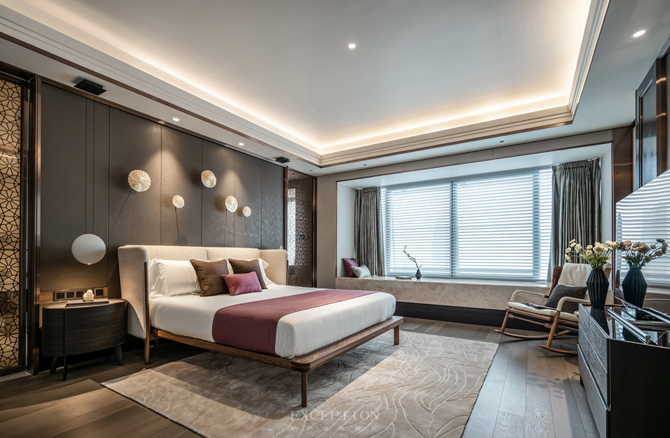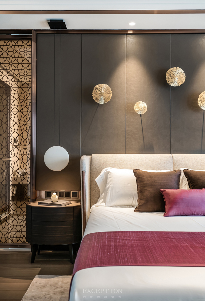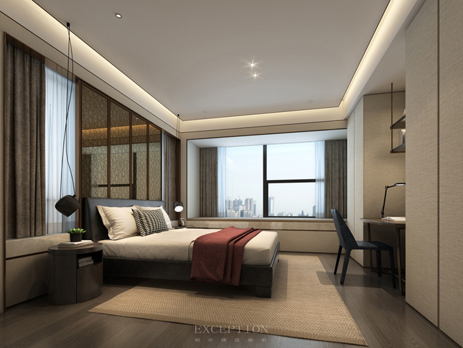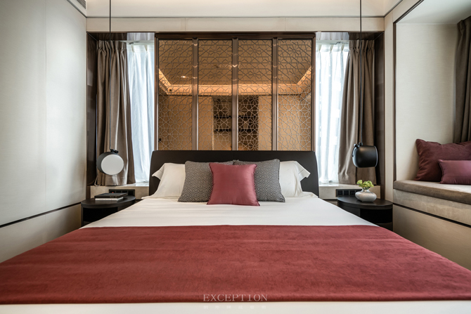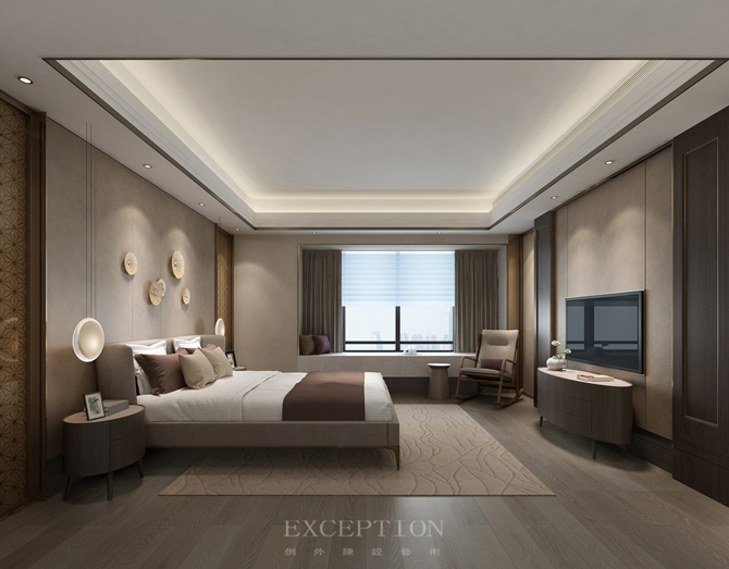 主臥無主燈設(shè)計(jì),而是將燈光收納于吊頂內(nèi),使室內(nèi)顯得更為柔和安適。設(shè)計(jì)將真正的尊享藏于每個(gè)細(xì)節(jié),精細(xì)打磨的墻面與木制地板、細(xì)膩柔軟的暖棕色床品,通過材質(zhì)的光感隱透簡凈高雅的質(zhì)感美學(xué)。