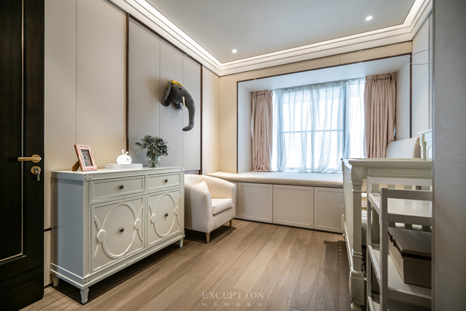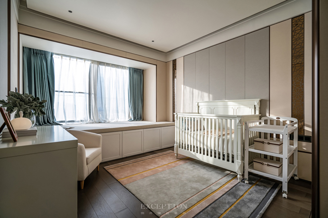 兩間嬰兒房以淡粉與水藍(lán)作為區(qū)隔,配備成對的嬰兒床、衣櫥,還有一件件童趣別致的玩具。在設(shè)計(jì)中,鴻藝源設(shè)計(jì)貫穿著對未來生活的考慮,為居住空間留有成長與進(jìn)化的可能。嬰兒房及兒童娛樂室均在背景墻的設(shè)計(jì)上做了預(yù)留手法,隨著孩童的成長,家長只需將家具進(jìn)行替換,無須進(jìn)行二次裝修。