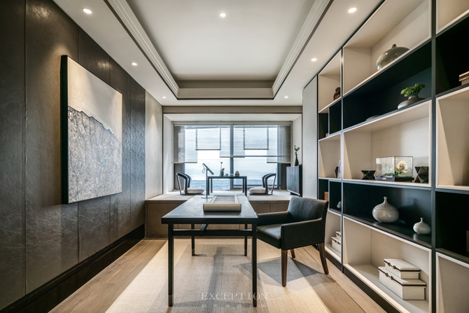 約64㎡的通透主臥套房設(shè)計(jì),以三進(jìn)的方式將書房、臥室、主衛(wèi)進(jìn)行構(gòu)設(shè),使空間具備更好的秩序感與私密性。書房以簡凈的黑白色調(diào)對話,現(xiàn)代極簡語匯與中式情韻在空間中相融相生,分外靜雅。飄窗區(qū)被設(shè)計(jì)為茶室,原木、清茶、松葉、花卉交匯在一起,清甜而微香。晨間的日光柔和,夜晚的月色明澈,一杯清茶,共待流年。