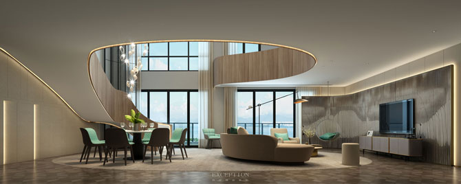 客廳的旋轉(zhuǎn)樓梯寓意和諧圓滿,與地毯、沙發(fā)互相呼應(yīng),透露天地合一的哲思境界。皮革順著圓融的扶手曲線延伸至更廣闊的空間,賦予曲徑通幽、別具一格的神秘感。