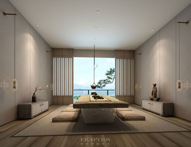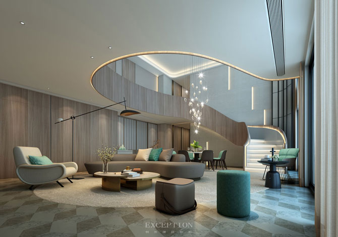 空間四周的圓形造型再一次體現(xiàn)出東方文化的包容性,在規(guī)律變換的幾何地板的韻律里,空間立體感凸顯。