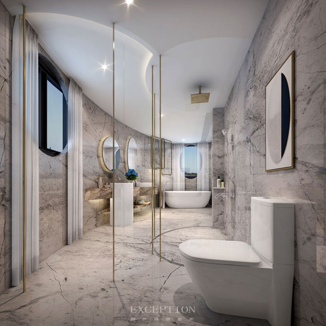 主衛(wèi)延續(xù)圓的意蘊(yùn),圓形窗、鏡賦予空間更開闊的視野,弧形隔斷再現(xiàn)了太極的神韻,一開一合間,臨摹出一派舒適自在。