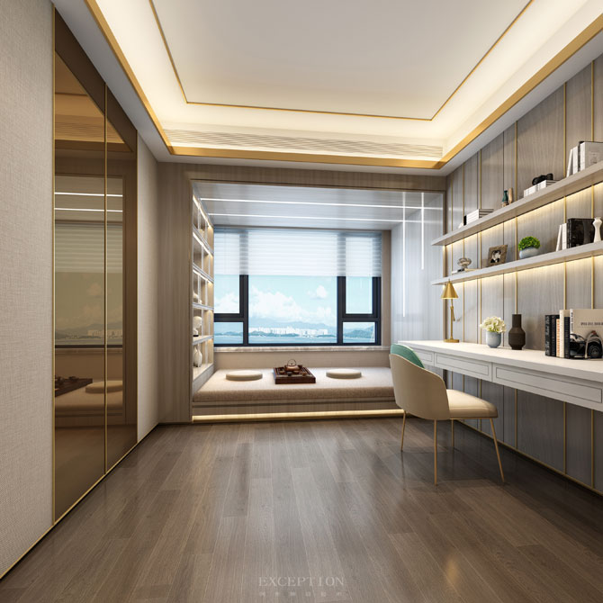 多功能房延續(xù)了線型的設(shè)計(jì),窗前線型透光片呼應(yīng)了墻面的木飾面,與對(duì)面簡潔平整的柜子形成鮮明的對(duì)比。