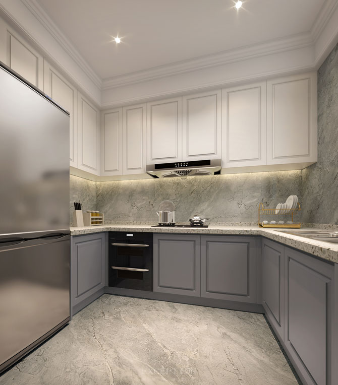 廚房以穩(wěn)重大氣的灰白創(chuàng)造出干凈整潔的情境,陽(yáng)光融入的午后,食物咕嚕烹煮升騰起的香氣在方寸之間將從美食里獲取的幸福無(wú)限放大……