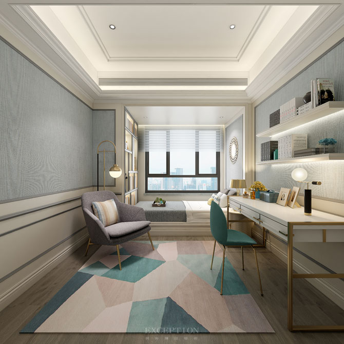 多功能房通過(guò)轉(zhuǎn)角造型的設(shè)計(jì)創(chuàng)造出一個(gè)安靜的閱讀角,幾何拼接的地毯增加了空間的靈動(dòng)性,金屬邊框元素的融入,不喧嘩,卻成就了空間的品位。