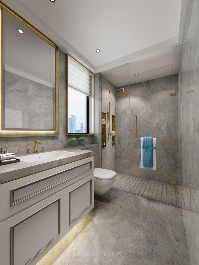衛(wèi)生間以灰色大理石為基礎(chǔ),沉穩(wěn)大氣,同等大小的浴室鏡平衡原有窗戶的限制,空間更加和諧立體,壁龕依舊是金屬元素鋪就,整個(gè)空間似一幅精致的畫卷,在水汽氤氳的夜晚徐徐展開。