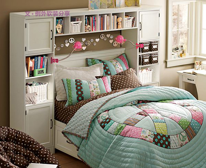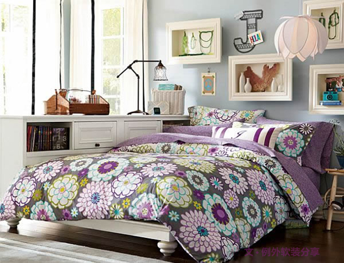 種:灰色,白色,藍(lán)色的搭配看起來色調(diào)簡單清爽,有一點酷酷的感覺,比較適合運動型女孩;第二種:咖色,白色,粉色的搭配看起來像草莓巧克力,給人活潑甜美的感覺,如果女兒是一個開朗活潑的姑娘這類搭配她一定會喜歡;第三種:白色,粉藍(lán)色,咖色,粉紅色,顏色搭配繽紛豐富,粉藍(lán)文靜,粉紅俏皮,靠包與沙發(fā)上的原點裝飾顯得十分可愛討喜;第四種:咖色,鵝黃為主體,加入花色圖案元素,這一方案頓時讓人覺得溫暖明朗,墻繪與裝飾相結(jié)合的手法別有創(chuàng)意,值得借鑒;第五種:紫色,白色同樣加入花色圖案,由于以紫色為主體色調(diào)整個方案顯得浪漫許多,相信不少女孩都會很喜歡。