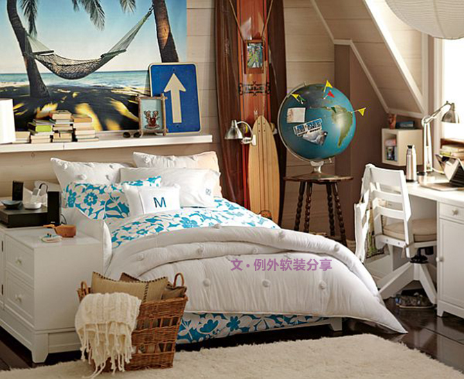 款主題鮮明:色調上以玫紅為主,灰色床品及彩色地毯作為襯托,在圖形元素上選取幾何圖案來裝飾整個空間,現代感十足,整體給人充滿活力的感覺。第二款以藍白搭配為主色調,配合沙灘主題掛畫、沖浪漫以及插著小旗子的地球儀,營造了海濱小屋的感覺,充滿新鮮與冒險。第三款就更具有童話色彩了,讓人聯(lián)想到阿拉公主的故事,黃色與藍色勾勒了一個清新淡雅的背景,而玫紅的家私又帶來傲嬌的女王氣質。第四、五款主要展示的是梳妝臺區(qū)域,一個純白的世界為女孩營造了一場唯美的夢境,容納著說不出的浪漫情懷。