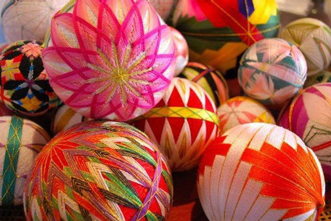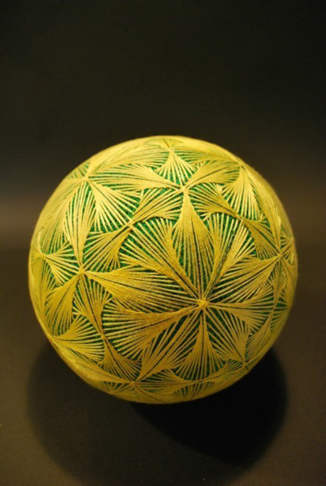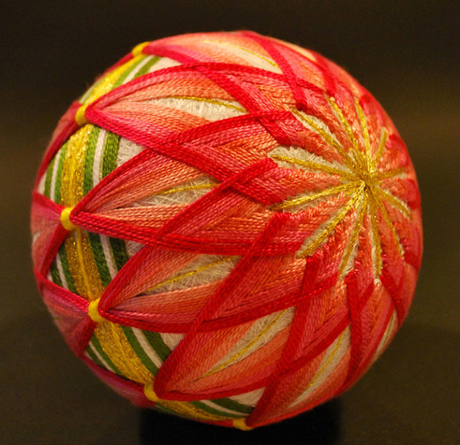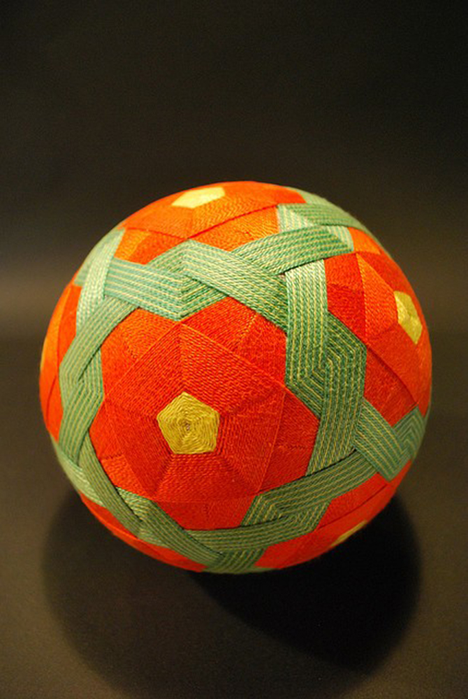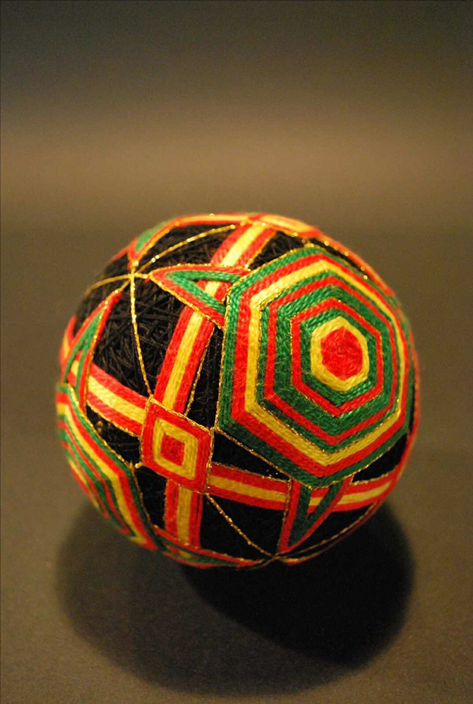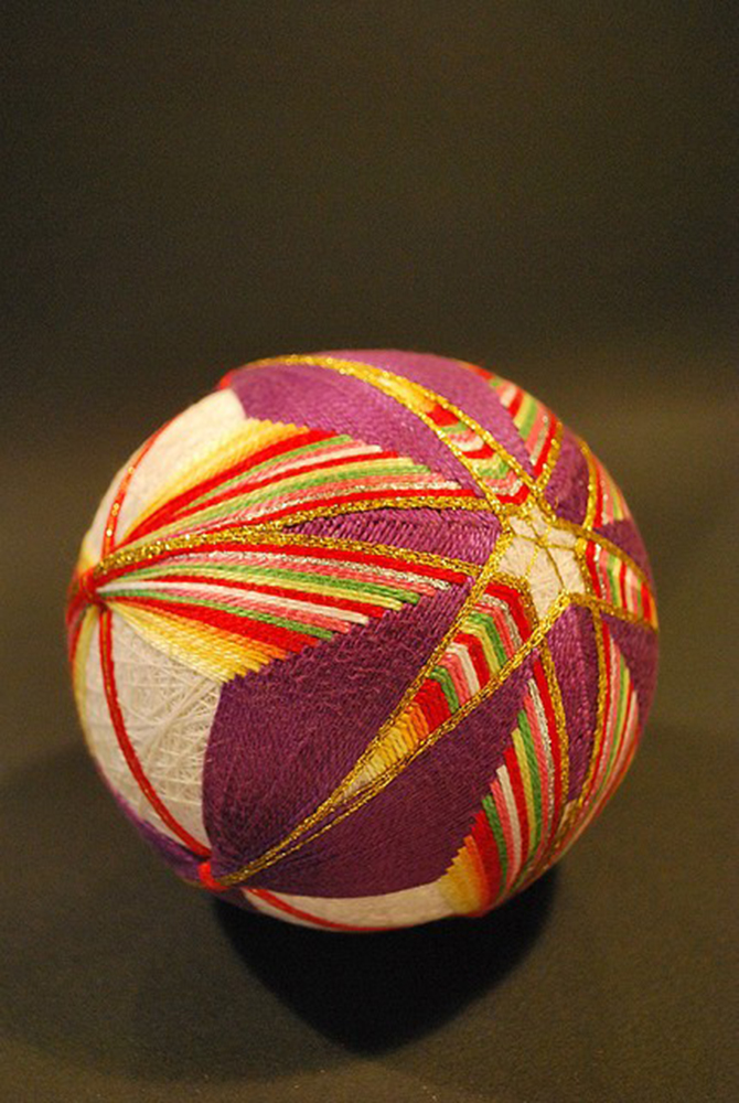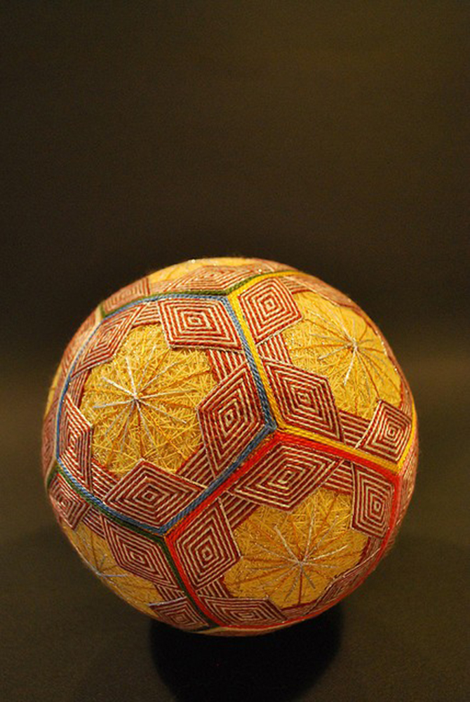 起初,鞠造型普通,但是在日本經(jīng)過幾個(gè)世紀(jì)的傳承,發(fā)展為一種民間手工藝術(shù),成為了一種日本傳統(tǒng)玩具,喚作手鞠球(日語:てまり、手まり)、又稱手球。它使用制作和服剩余的邊角料,填充成球狀,然后用多彩絲線纏繞成幾何圖形,形態(tài)略大于壘球,略小于手球。