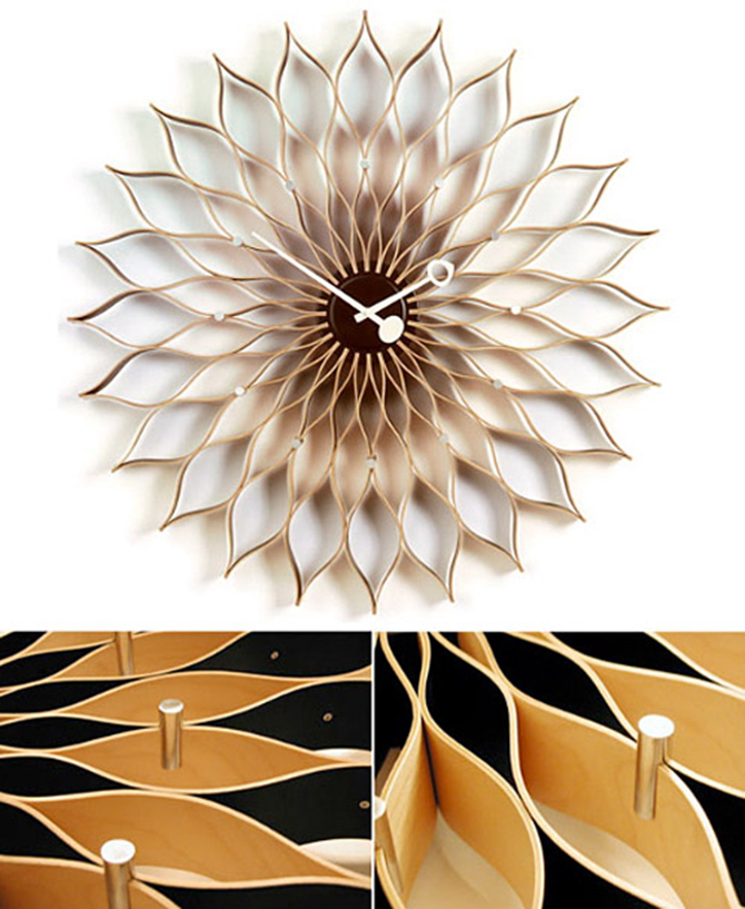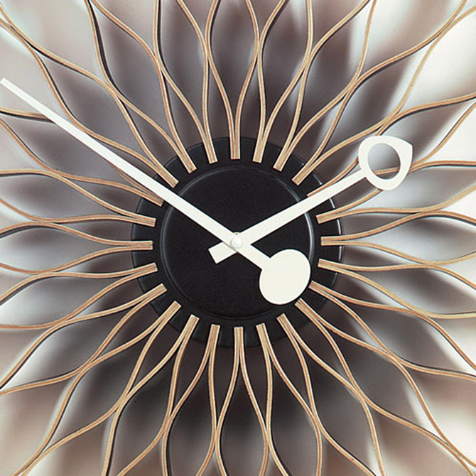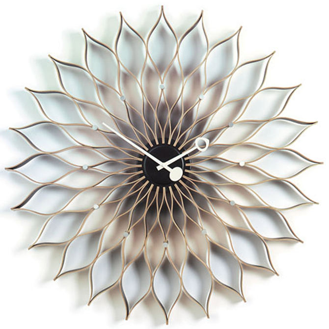 這款名為Sunflower(太陽花)的掛鐘至今仍在生產,木片彎成的花瓣細致美麗,好似墻壁上盛放的一朵太陽花,流露作者對自然的熱愛。Sunflower  clock用白樺木和上漆金屬制成的鐘面大氣而壯觀,直徑75cm,盡管價格不菲,還是很難讓人不被向日葵的別致造型所打動