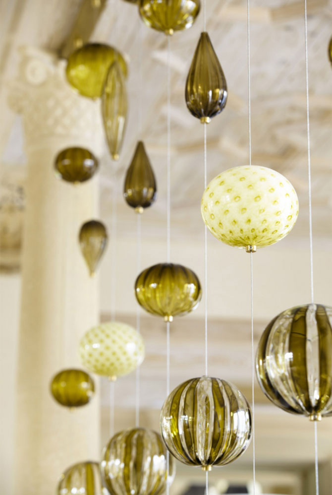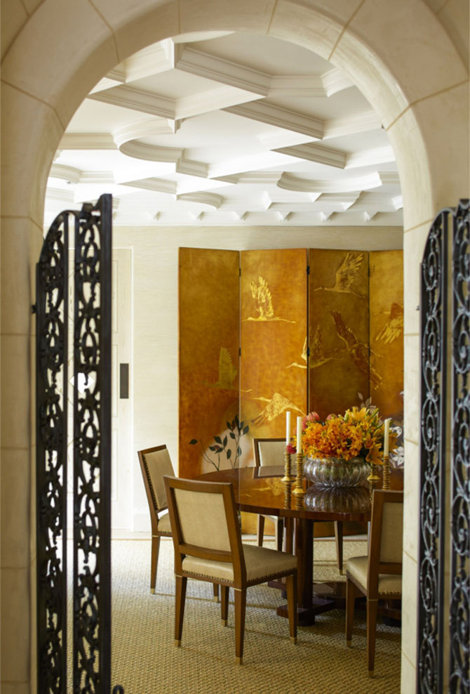 天花板上的美麗紋理是實(shí)木雕刻而成,富有規(guī)律的幾何圖案化解了單薄的視覺(jué)感官,各種線(xiàn)條的融入讓吊頂生動(dòng)突出。中間配以水晶吊燈,燈光閃爍猶如天上耀眼繁星,給人一種寂靜空曠的神秘之感。