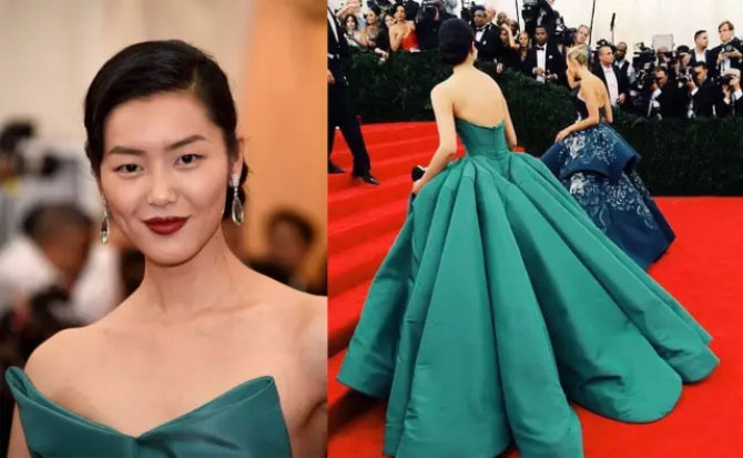 2014年Met Gala的紅毯上,劉雯著一身藍(lán)綠色禮服,被評(píng)為當(dāng)年的best dress之一。